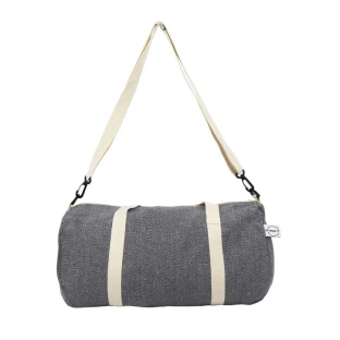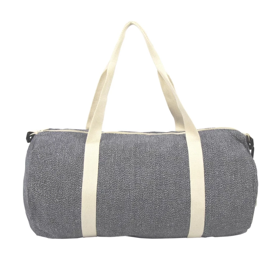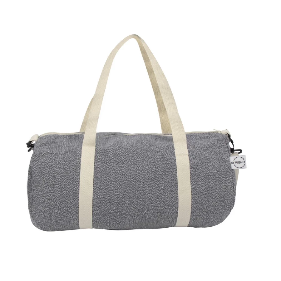 Torba sportowa, podróżna wykonana z bawełny z recyklingu i poliestru z recyklingu, posiada certyfikat GRS (Global RecycIed Standard), duża przegroda główna na zamek błyskawiczny, uchwyty i regulowany pasek na ramię