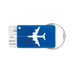 Aluminiowa przywieszka na bagaż lotniczy z etykietą na nazwisko i adres. W komplecie uchwyt.